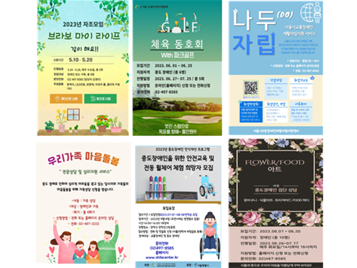 | 중도장애 사업 정보제공 포스터 | 각 사업별 홍보자료(온라인 정보제공) | 장애인 가족 자조모임(05월 24일) | 장애인 가족 자조모임(06월 22일) |